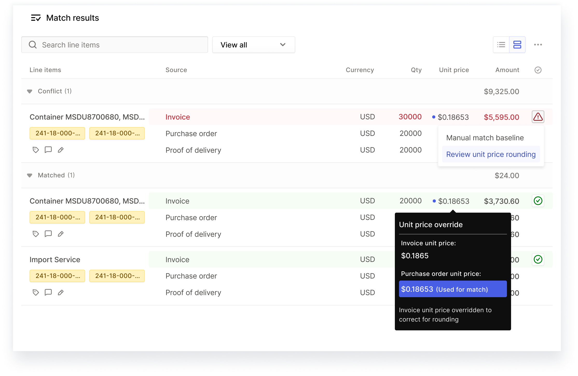 An AP clerk notices discrepancies on nearly every line of a 200-line invoice. On closer inspection, it turns out the discrepancies are just rounding errors. By the 10th invoice with the same issue, frustration builds as the tedious reviews slow down their already packed queue.